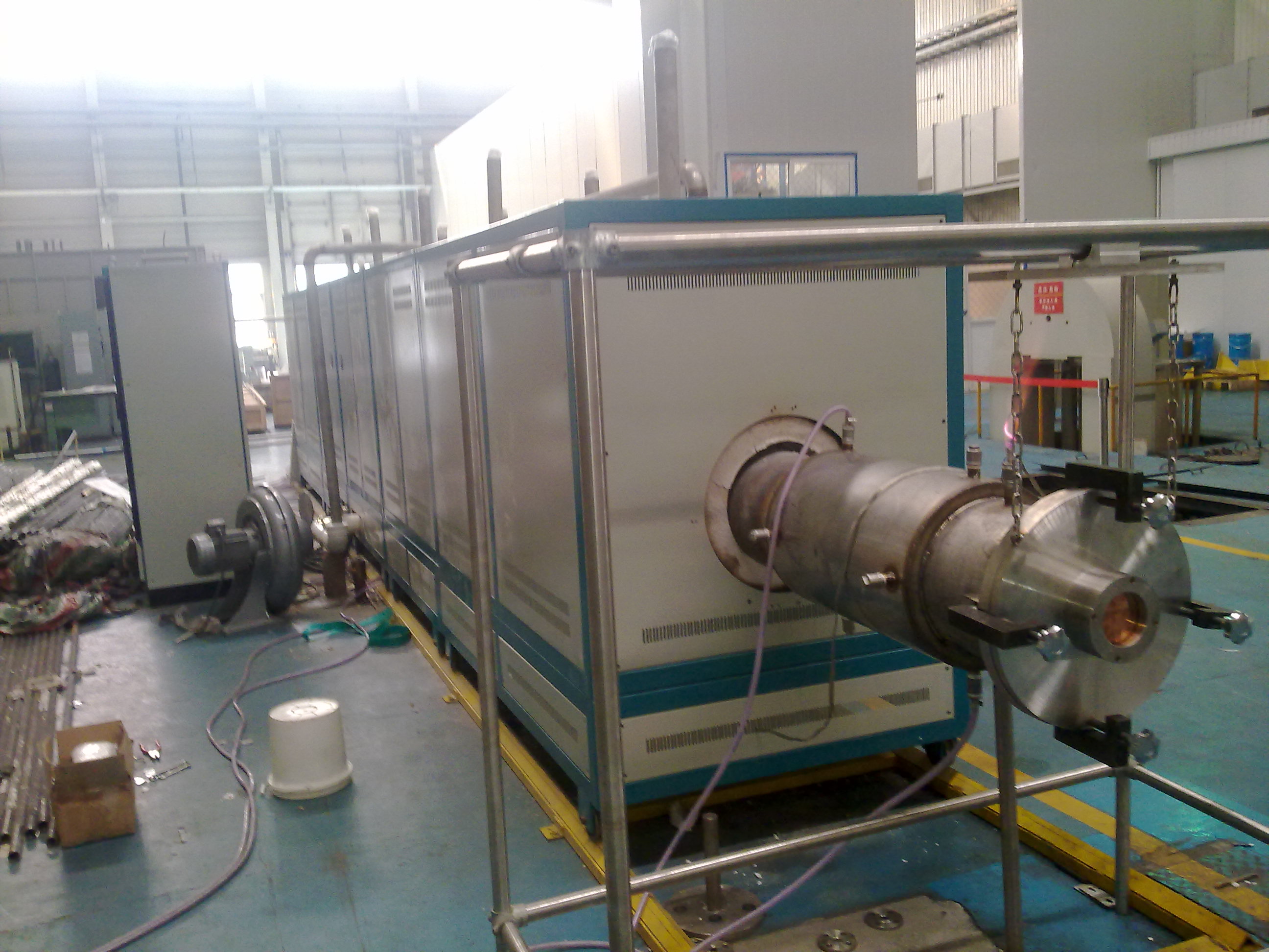 3、爐體結(jié)構(gòu),電爐外觀采用高溫噴塑,耐溫、耐氧化、耐酸堿;雙色搭配外觀大方、美觀;外殼采用國(guó)標(biāo)角鋼、冷軋板精細(xì)焊接而成,雙層外殼,內(nèi)外隔離,風(fēng)冷結(jié)構(gòu),外表溫度不大于40℃;爐體采用國(guó)標(biāo)角鋼、冷軋板精細(xì)焊接而成,再用車床精細(xì)加工,密封效果好;每段爐體下方安裝有移動(dòng)輪,移動(dòng)輪在軌道上行駛電爐直線運(yùn)動(dòng),軌道(共五段)總長(zhǎng)15mm,可拆卸;爐體連接有螺絲連接和輔助搭扣鎖;在電爐爐體的第一段和尾段外安裝有導(dǎo)向軸承,方便爐管的安裝,爐體結(jié)構(gòu)考慮將來(lái)加長(zhǎng)設(shè)計(jì),為后期電爐改造預(yù)留設(shè)計(jì)。