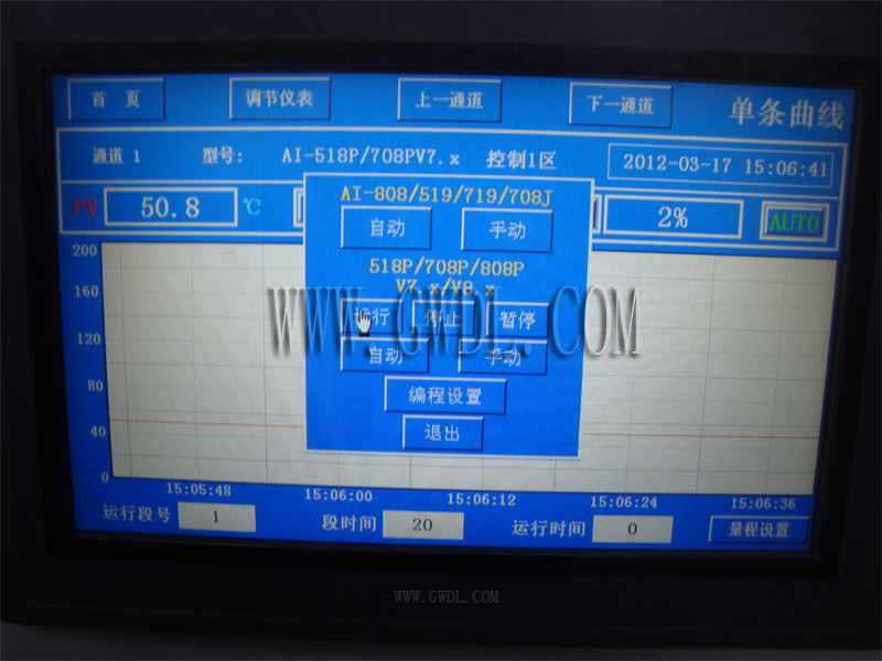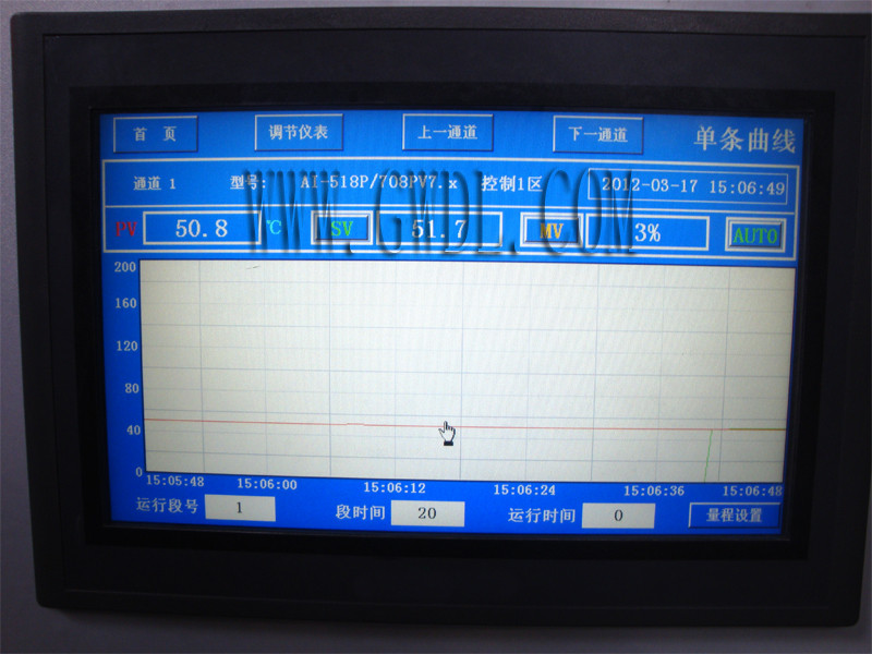 實(shí)時(shí)狀態(tài)顯示 | 運(yùn)行曲線名稱、運(yùn)行段號(hào)、段時(shí)間、段運(yùn)行時(shí)間、數(shù)字溫度、實(shí)時(shí)曲線、功率輸出百分百 |
